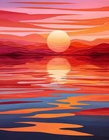 Een levendig digitaal schilderij met de adembenemende schoonheid van een zonsondergang boven een rustig waterlichaam. Vurige sinaasappeltinten, dieprood en zachtroze kleuren de lucht in horizontale banden en weerspiegelen verbluffend helder op het kabbelende oppervlak eronder. Verre, wazige bergen vormen een serene achtergrond voor de stralende zon die aan zijn afdaling begint. Het water gaat over van warme, reflecterende tinten nabij de horizon naar koeler blauw en paars op de voorgrond, wat een fascinerend gevoel van diepte en rust creëert.