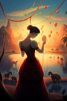 Deze betoverende digitale illustratie toont Sneeuwwitje in een prachtige rode jurk bij een rustig meer in de schemering, omringd door kleurrijke dieren die de scène tot leven brengen. De warme kleuren van de zonsondergang omhullen de compositie en creëren een kalme en magische sfeer. Haar blik in de verte geeft de scène een mysterieuze sfeer en nodigt de kijker uit om de diepte van het moment te verkennen. Het kunstwerk vangt prachtig de klassieke Disney-animatiestijl door fantasie met realisme te combineren, waardoor het een betoverend stuk is voor kopers die op zoek zijn naar unieke digitale kunst.