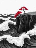 Dit fascinerende kunstwerk, getiteld "Crimson Resilience," is een krachtige studie in contrast en emotie. Het heeft een dynamische afbeelding in grijstinten van een turbulente oceaan met massieve, kolkende golven die de rauwe kracht van de natuur benadrukken. Een donkere, imposante klif staat tegenover de meedogenloze zee. Het oog wordt echter onmiddellijk getrokken door de twee bomen die wankel op de rand van de klif staan. Hun bladeren zijn levendig en opvallend karmozijnrood en vormen de enige uitbarsting van kleur in de verder monochrome scène. Deze juxtapositie van het levendige rood tegen het dramatische zwart-wit roept een gevoel op van blijvende kracht en eenzame schoonheid te midden van chaos.
