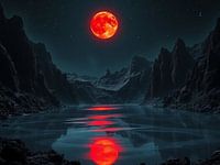 Dompel jezelf onder in de etherische schoonheid van "Crimson Celestial Reflection," een ontzagwekkend digitaal schilderij dat een adembenemend nachtelijk landschap vastlegt. Een kolossale, intens lichtgevende rode maan domineert de donkere hemel en werpt een buitenaardse gloed die de rustige wateren eronder in vurige tinten schildert. Torenhoge, grillige bergtoppen omlijsten het tafereel en hun silhouetten voegen diepte en drama toe aan dit kosmische panorama. De levendige reflectie van de bloedmaan op het stille meer creëert een fascinerende symmetrie die uitnodigt tot contemplatie en verwondering. Dit werk roept gevoelens op van mysterie, sereniteit en de majestueuze kracht van het universum, waardoor het een opvallende aanvulling is op elke kunstcollectie. Perfect voor liefhebbers van hemelse thema's, fantasielandschappen en dramatische natuurlijke schoonheid.