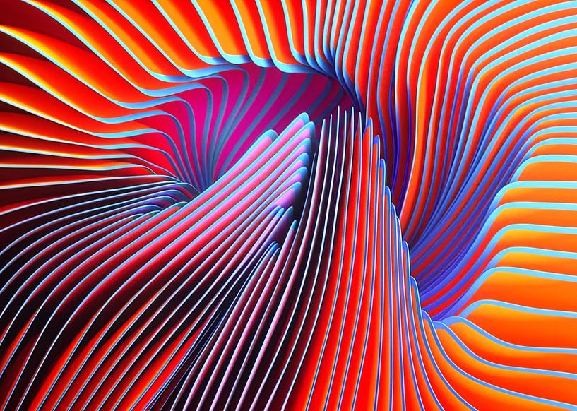 Gedraaide linten van vurig rood, elektrisch blauw en magenta neon strepen door een hypnotiserende 3D-tunnel, gloeiend met een metaalachtige glans en oneindige diepte. Deze futuristische digitale kunst pulseert met cyberpunkbewegingen en een hoog contrast.