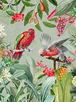 Deze vintage collage straalt tropische elegantie uit met een fascinerende mix van weelderig gebladerte en levendig fruit. Twee opvallende rode kaketoes zitten in het midden en hun vurige verenkleed vormt een dramatisch middelpunt. Hun felle, heldere verenkleed contrasteert prachtig met het weelderige groen en het tropische fruit dat hen…