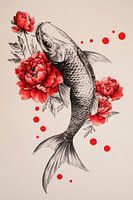 In een harmonieus samenspel van beweging en stilte ontvouwt een koi, majestueus en vol leven, zich tussen felrode pioenrozen. Zijn glinsterende schubben weerkaatsen het licht en creëren een magisch aura, terwijl delicate rode stippen het geheel levendiger en dynamischer maken. Een fascinerend samenspel van natuur en elegantie.
