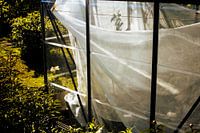 Warm zonlicht glijdt over een kas waar doorschijnend folie losjes is gedrapeerd. De strakke lijnen van het zwarte frame contrasteren mooi met het zachte materiaal, terwijl groen rondom voor een natuurlijke rand zorgt. De tinten groen‑goud‑wit en de subtiele reflecties geven het beeld een stille, wabi‑sabi sfeer—modern, kalm en botanisch.
