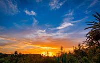 Kasba bij zonsondergang, Marokko. Links onderin de foto zie je het silhouet van de ruïne van een kasba. Een Kasba is van oorsprong een verdedigingswerk. Tegenwoordig zijn het ruïnes of ze zijn gerestaureerd tot hotel of soortgelijk onderkomen voor toeristen.