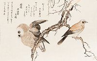 Kashidori Fukuro van Utamaro Kitagawa (1753-1806), een traditionele Japanse ukiyo-e stijl illustratie van gaaien en uilen en een Japans gedicht geschreven op beide zijden van de pagina's.