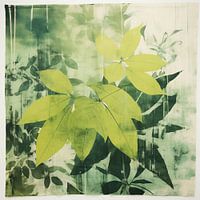 Mixed media afbeelding van bladeren in diverse groentinten op een witbeige achtergrond. Meerdere bladeren worden getoond, waaronder het kastanjeblad. Drie-laags afgedrukt, waardoor het een prachtig effect geeft. Passend bij diverse stijlen en trends. Kan ook als drieluik geplaatst worden samen met de afbeeldingen van het beukenblad en monstera blad.