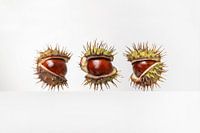 3 open wilde kastanjes op een rij, ze lijken een beetje op figuurtjes, buitenaardse wezentjes of toch gewoon mooie herfst vruchten van de natuur