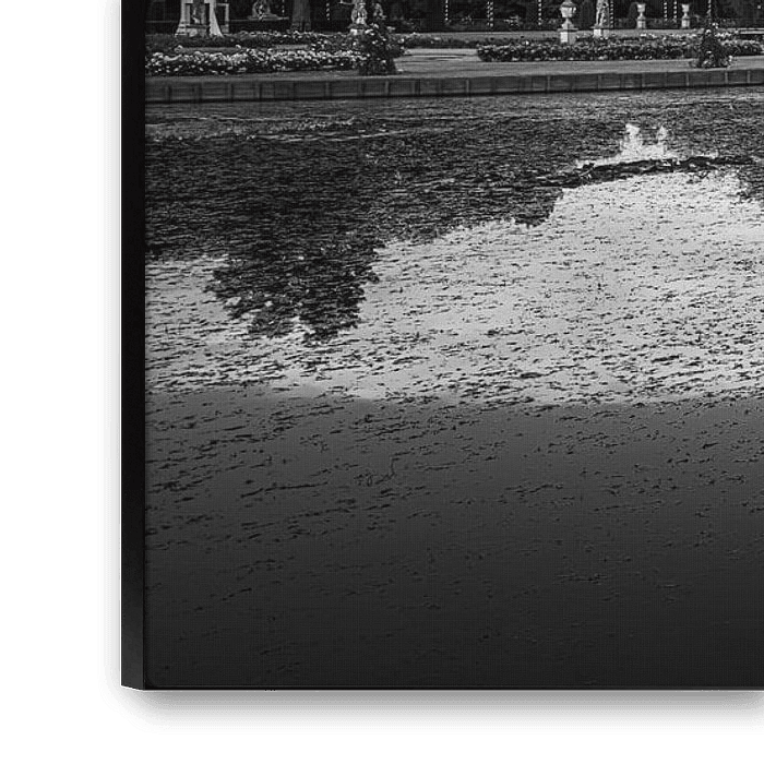 Een 2x1 panorama foto in zwart-wit van een avond bij het Kasteel Anholt of Waterburcht Anholt. Een waterburcht die tevens naamgever was aan de voormalige stad Anholt, nu een voorstad van Isselburg in Noordrijn-Westfalen.