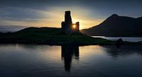 Panorama van Ardvreck Castle weerspiegelingen op Loch Assynt in zonsondergang licht, Schotland