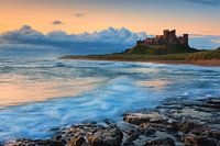 Aan de oostkust van Engeland, in het Northumberland-gebied, ligt verborgen in de duinen, het kasteel van Bamburgh. Foto gemaakt tijdens zonsopkomst.