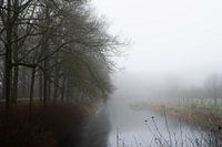 Landschap bij kasteel Doorwerth, in Gelderland. Je ziet de gracht bij het kasteel op een grijze winterochtend. De mist zorgt voor een mystieke sfeer.