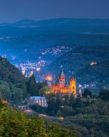 Kasteel Drachenburg tijdens het blauwe uur op een zomeravond. Kasteel Drachenburg staat langs de Rijn, nabij Königswinter in de deelstaat Noord-Rijn-Westfalen, Duitsland.