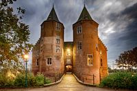 Sfeervolle avondopname van het Middeleeuwse kasteel Dussen, in de provincie Noord-Brabant.