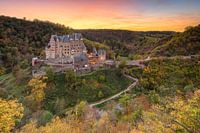 Uitzicht op het kasteel Eltz bij Wierschem in Rijnland-Palts bij een prachtige kleurrijke zonsondergang.