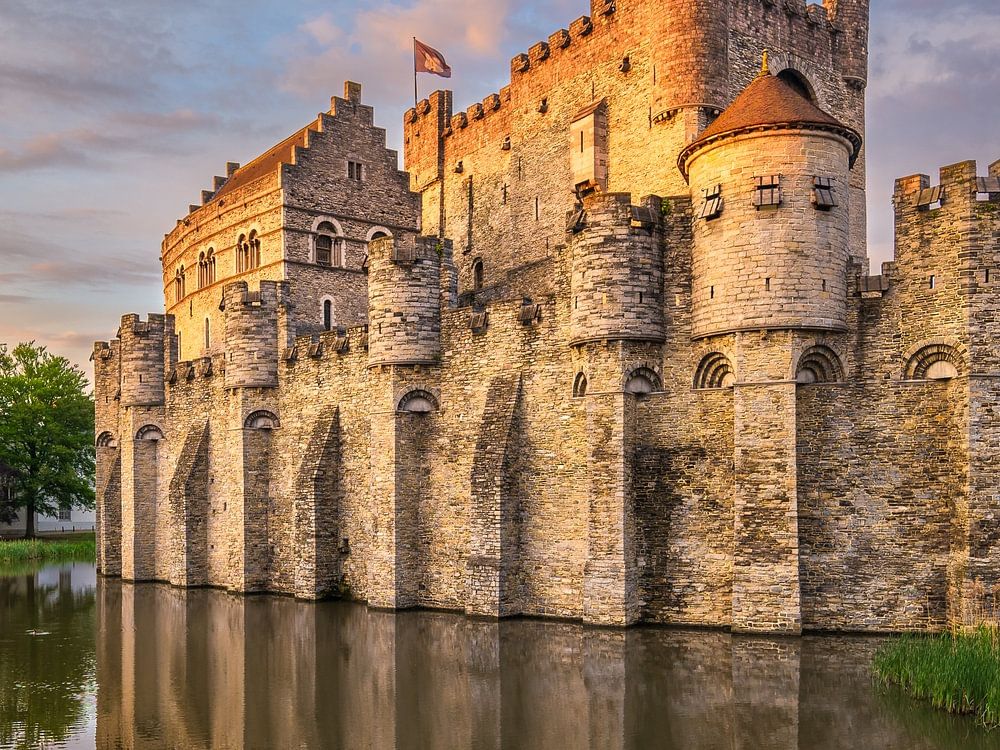 Kasteel Gravensteen bij zonsondergang in Gent, België