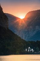Zonsopgang bij kasteel (Schloss) Grub aan het Hallstätter See, Oostenrijk. Kasteel Grub is gebouwd in 1522 en bevindt zich aan de andere kant van het Hallstatt-meer.