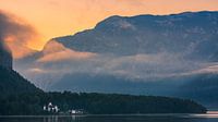 Een horizontale 16:9 foto van een zonsopkomst bij kasteel (Schloss) Grub aan de Hallstätter See, Oostenrijk.