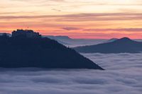 Over ‘Kasteel Hohenneuffen - Zonsondergang met mistzee op de rots van Beuren’ van Jiri Viehmann