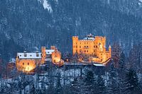 Een winter landschap tijdens zonsondergang bij kasteel Hohenschwangau, in de gemeente Schwangau, gelegen nabij Füssen, in de Allgäu, in Beieren, zuid Duitsland.