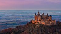 Een 16:9 foto van een prachtig uitzicht op kasteel Hohenzollern in de herfst vanaf het uitkijkpunt Hohenzollernblick, gelegen nabij Hechingen, Bisingen en Albstadt in Baden-Württemberg, Duitsland, tijdens een schitterende zonsondergang.