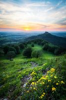 Kasteel Hohenzollern bij zonsondergang vanaf de Zeller hoorn. In de buurt van Hechingen in Baden-Württemberg