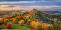 Kasteel Hohenzollern in Baden Württemberg in de gouden herfst. De omringende bomen en bossen van het kasteel zijn bijzonder mooi om naar te kijken in de herfst. Vooral bij zonsondergang gloeien de kleurrijke herfstbladeren in prachtige bruine, gele, beige en rood-oranje tinten. 210067ays