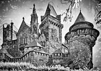 Westaanzicht van de Schauburg Kreuzenstein in Oostenrijk, gebouwd aan het eind van de 19e eeuw in de stijl van een middeleeuwse vesting.