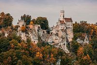 Herfstkleuren op een vroege ochtend bij Kasteel Lichtenstein, een kasteel dat werd gebouwd van 1840 tot 1842 in neogotische stijl, gelegen in de Zwabische Jura van Zuid-Duitsland.