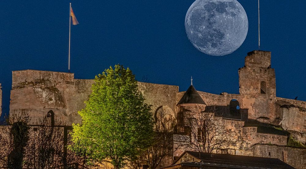De verlichte kasteelruïne Nanstein in Landstuhl zien op zo'n heldere, wolkenloze avond is betoverend.