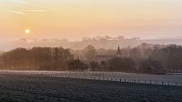 De zon verdrijft de mist in het dal van de Geul bij kasteel Neubourg in Gulpen