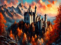 Ervaar de magie van kasteel Neuschwanstein met dit betoverende kunstwerk bij zonsondergang. Johanna's meesterlijke kunstwerk vangt de sprookjesachtige charme van deze iconische bezienswaardigheid. Een must-have voor kunst- en reisliefhebbers.