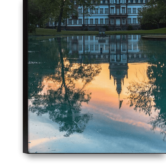Koop de foto Kasteel Philippsruhe met kasteelpark en weerspiegeling in het meer van Fotos by Jan Wehnert op canvas, aluminium dibond, (ingelijste) fotoprint, behang en ArtFrame, op maat geprint in Fine-Art kwaliteit.