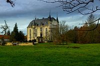 Doorkijkje tussen de bomen naar Kasteel Schaloen in Schin op Geul tijdens een gure herfstdag. Waarbij dreigende wolken zichtbaar zijn en de bladeren bijna allemaal van de bomen zijn afgewaaid.