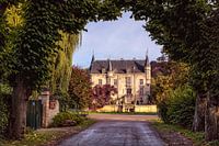 Kasteel Schaloen in Oud-Valkenburg gezien vanuit de laan bij zonsopkomst op een herfstdag (Zuid-Limburg, Nederland).