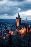 Het historische kasteel van Wernigerode werd gefotografeerd met verlichting op het blauwe uur.