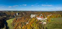 Luchtfoto van kasteel Wildenstein bij Leibertingen, omgeven door herfstvegetatie, boven-Donauvallei