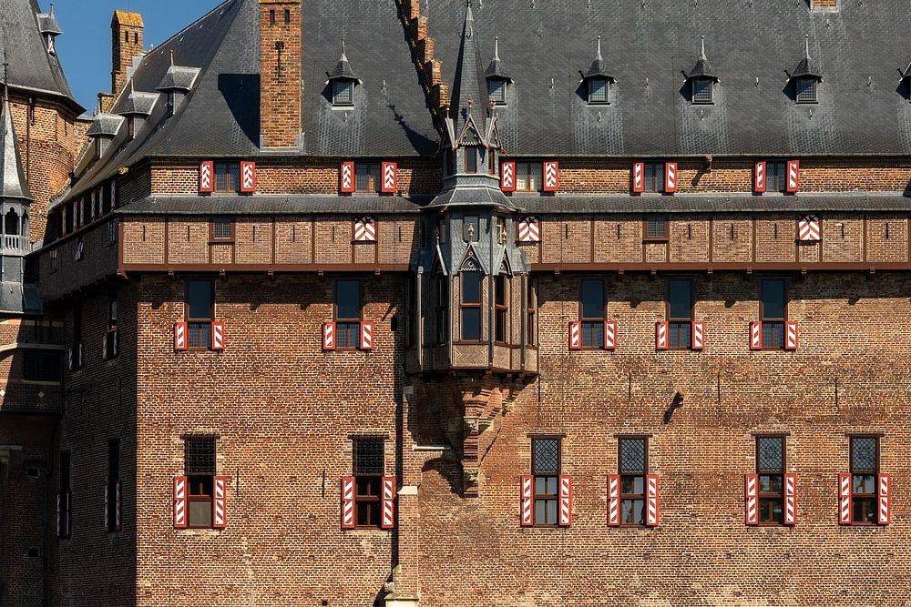Trefwoorden: hert, gewei, Kasteel de Haar, Haarzuilens, kasteeltuin, natuur, dierenfoto, wild, Nederlandse natuur, landschap, zonlicht, bosrijk, rustgevend, wanddecoratie, natuurfotografie, edelhert, buitenleven, historisch landschap, serene sfeer, parklandschap.