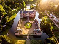 Een prachtig kasteel in Nederland van boven bij zonsondergang. De foto is gemaakt met een drone. De warme gloed in de foto is bijna voelbaar!