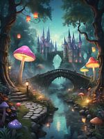Dit kunstwerk vangt de magie van een sprookjesachtige wereld, waarin een betoverd kasteel zich majestueus aftekent tegen de achtergrond van een mystiek bos. De scène wordt verlicht door zachte lantaarns en gloeiende paddenstoelen, die een warme, uitnodigende gloed verspreiden. Een kronkelend pad van stapstenen leidt de kijker naar een…