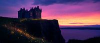 De hemel schittert in magische kleuren boven een mystiek kasteel dat majestueus op een klif staat. De gouden lichtjes langs het wandelpad geven het scenario een dromerige sfeer. Deze indrukwekkende compositie past perfect in een woonkamer, waar het zorgt voor conversatie en inspiratie voor avontuur.