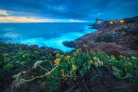 Het kasteel van Boccale en de zandstenen rotsen van Romito tijdens een storm bij zonsondergang en een plant op de voorgrond. Fotografie met lange belichting. Livorno, Toscane, Italië, Europa