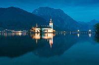 Kasteel Orth in Gmunden met voetgangersbrug over de Traunsee en Traunstein bij schemering.