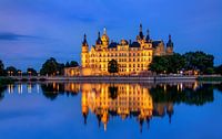 Het prachtige kasteel van Schwerin ligt in de gelijknamige stad op een klein eiland in de Schweriner See, in de Duitse deelstaat Mecklenburg-Vorpommeren. . Ooit was het de woonplaats van hertogen van Mecklenburg-Schwerin, maar tegenwoordig zetel van het parliament van de deelstaat Mecklenburg-Voorpommeren. Het mooie kasteel is vanuit vele hoeken te bewonderen. Hier zien we een mooi uitzicht op het verlichte bouwwerk in de avond.