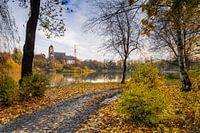 De kasteelvijver van Chemnitz op een kalme herfstochtend. Men kijkt in de richting van de slotkerk en de Lulatsch.