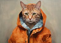 Kat Schilderij | Kat in Oranje - Dit is een speels, realistisch portret van een kat gekleed in een helder oranje jas met een glanzende, lichtblauwe voering. De achtergrond is neutraal en laat het onderwerp echt naar voren komen door de contrastrijke en levendige oranje tinten. Details zoals de textuur van de vacht en de glimmende ogen zijn prachtig weergegeven.