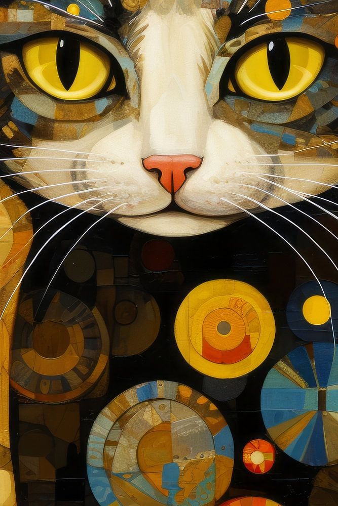 Elk kunstwerk in deze collectie is doordrenkt met de weelderige esthetiek van de art nouveau-beweging, gekenmerkt door weelderige versieringen, organische vormen en levendige kleuren. De katten in deze werken worden afgebeeld met een aura van majesteit en zelfverzekerdheid, omringd door golvende patronen en decoratieve elementen die de diepte van hun karakter benadrukken.