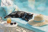 Zwarte kat slapend op ligbed bij zwembad. Strohoed, zonnebril en drankje geven dit schilderij een frisse, zomerse en relaxte sfeer. Voor pure zomerse rust.