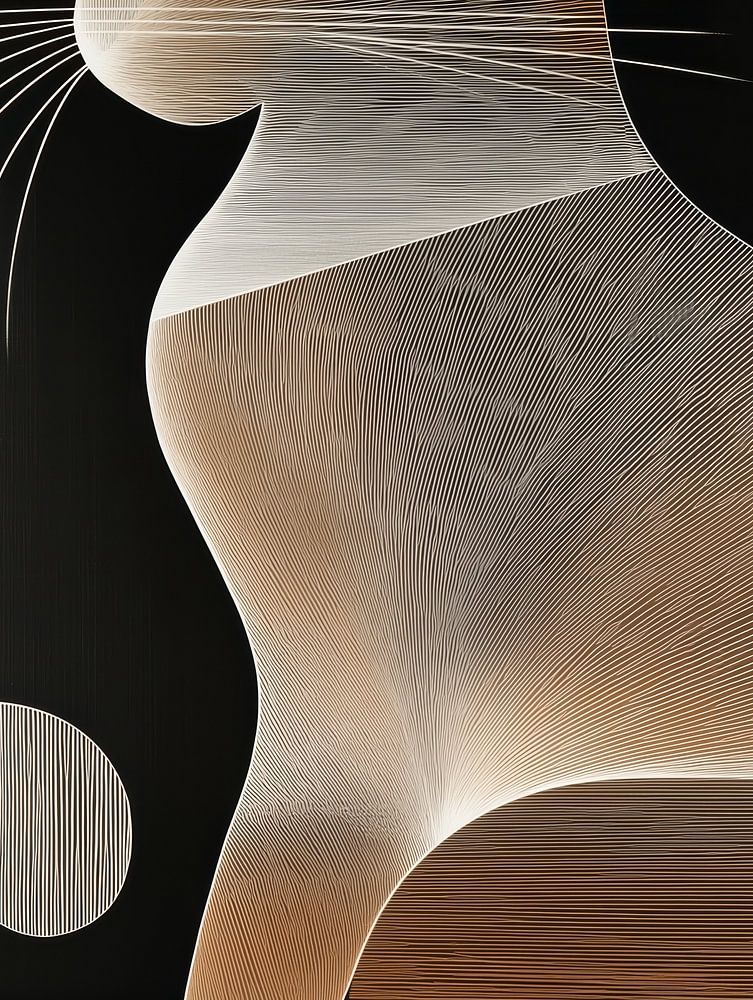 Dit werk vangt de mysterieuze en gracieuze essentie van een kat in een krachtig en stijlvol silhouet. Tegen een diepe, donkere achtergrond komt de vorm van de zittende kat prachtig naar voren, gevuld met een dynamisch samenspel van kleuren. Levendige tinten blauw, subtiel oranje en stralend wit vloeien op een marmerachtige wijze in elkaar over, wat een gevoel van diepte en innerlijke energie creëert. De compositie is minimalistisch maar krachtig, waarbij de focus volledig ligt op de iconische vorm en het intrigerende kleurverloop. Het werk straalt een moderne en verfijnde elegantie uit, en roept een gevoel van kalmte en mysterie op. Het is een perfecte, subtiele blikvanger voor wie op zoek is naar een stijlvol en artistiek werk met een ingetogen maar toch boeiend karakter.