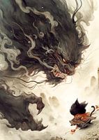 Een fantastische illustratie, waarschijnlijk geïnspireerd door Oost-Aziatische kunststijlen, toont een massief, mythisch wezen.